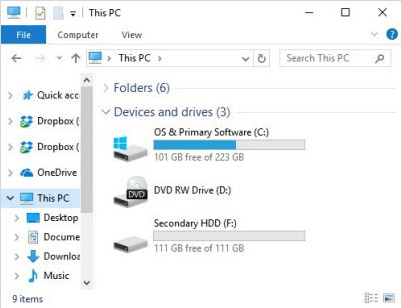 اگر از ویندوز ۱۱، ویندوز ۱۰ یا ویندوز ۸ استفاده میکنید، میتوانید تمام درایوهای نصبشده را در فایل اکسپلورر مشاهده کنید. میتوانید با فشار دادن کلید ویندوز + E، فایل اکسپلورر را باز کنید. در پنل سمت چپ، گزینه This PC را انتخاب کنید و تمام درایوها در سمت راست نمایش داده میشوند. تصویر صفحه، نمای معمولی از This PC را با سه درایو نصبشده نشان میدهد.