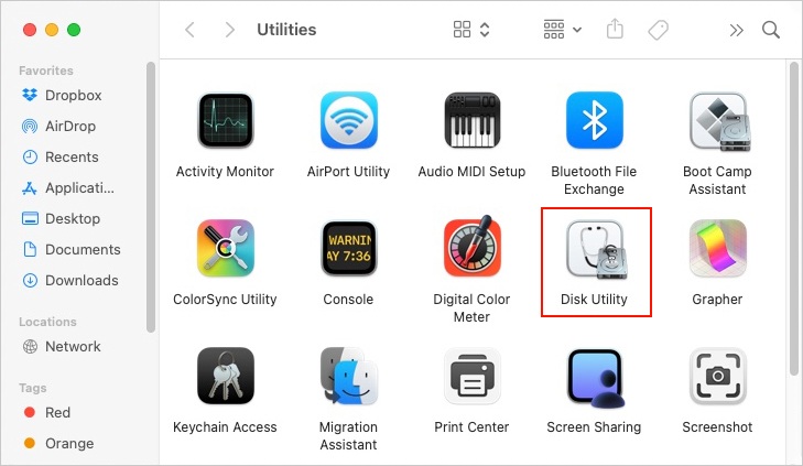 2. در پنجره Utilities که باز میشود، روی آیکون Disk Utility دوبار کلیک کنید.