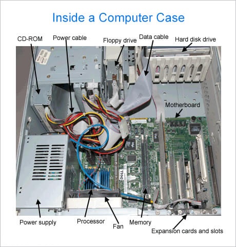 داخل یک کامپیوتر رومیزی آنقدرها هم که فکر میکنید پیچیده نیست. در زیر مثالی از اجزای اصلی تشکیل دهنده داخل یک کامپیوتر آورده شده است.