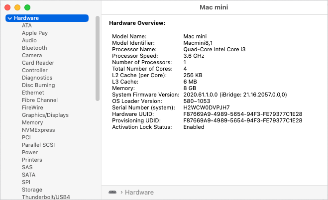 در macOS، برای مشاهده سختافزار نصبشده در برنامه اطلاعات سیستم، روی سختافزار کلیک کنید تا اطلاعات اولیه در مورد پردازنده و حافظه را مشاهده کنید. برای اطلاعات دقیقتر، روی فلش کنار سختافزار در macOS کلیک کنید و روی یک نوع سختافزار کلیک کنید تا اطلاعات مربوط به سختافزار نصبشده در رایانه را مشاهده کنید.